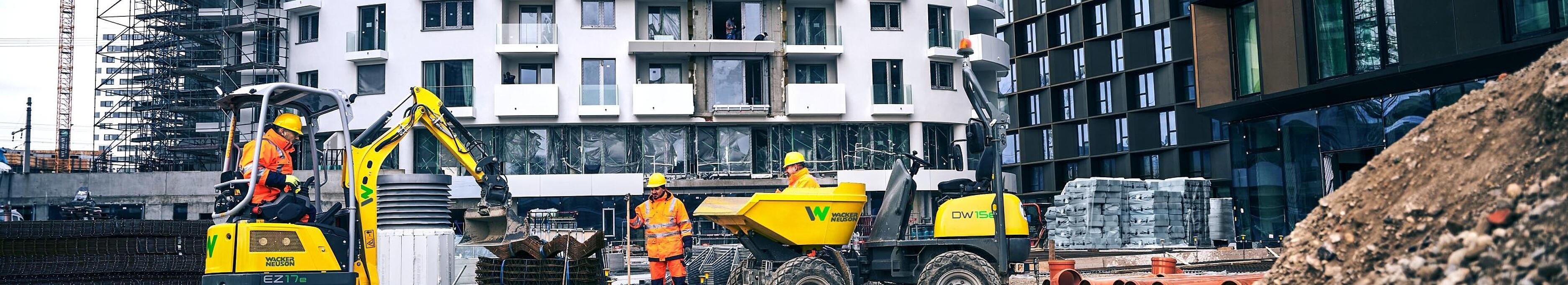 Wacker Neuson zero tail excavator EZ17e in application on a construction site in the city.